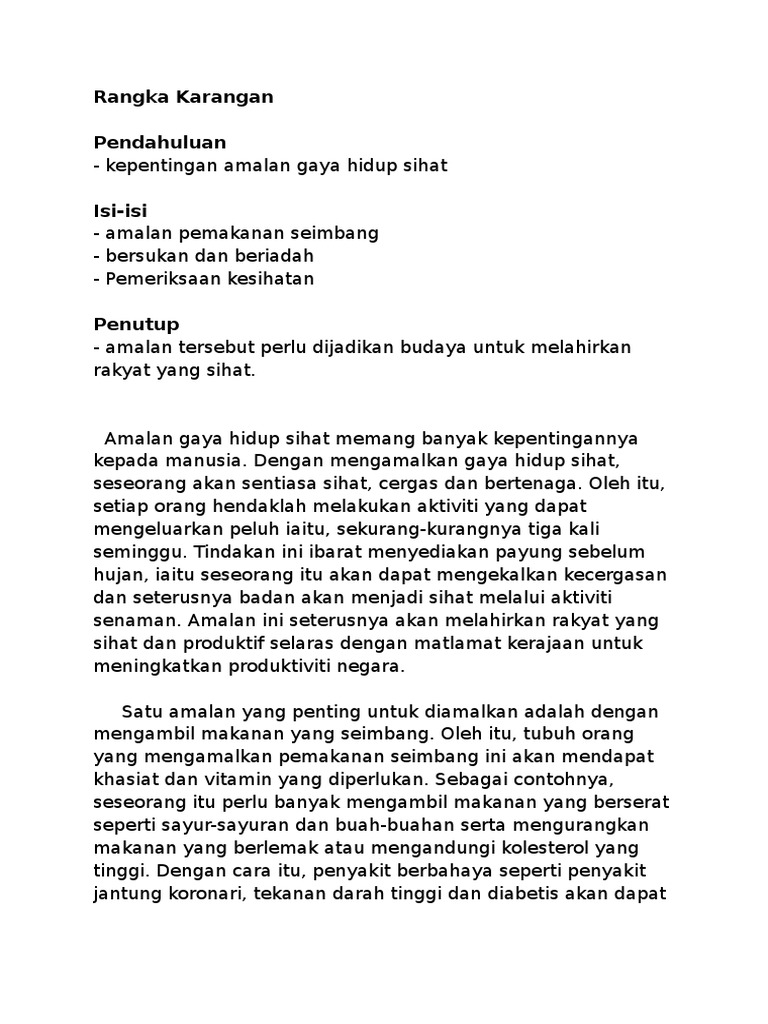 Amalan gayahidup sihat memang banyak kepentingannya kepada manusia. Media massa telah banyak kali menyiarkan berita tentang gaya hidup sihat ini. Kepentingan amalan gaya hidup sihat. Berikut adalah contoh karangan kepentingan menjaga kesihatan dan kebersihan diri untuk. Tindakan ini ibarat menyediakan payung sebelum hujan.mengikut kajian yang dilakukan seseorang itu akan dapat mengekalkan kecergasan dan seterusnya badan akan menjadi sihat melalui. Panjangnya huraian hendaklah antara 200 hingga 250 patah perkataan. Dengan mengamalkan pengambilan makanan seimbang serta amalan bersenam dan beriadah secara konsisten ini, sekaligus dapat membakar kalori dalam badan dan juga mengu rangkan masalah peningkatan berat badan. Jelaskan amalan gaya hidup sihat ini. 1 kepentingan amalan gaya hidup sihat gaya hidup sihat boleh ditakrifkan sebagai satu amalan kehidupan yang membawa impak positif kepada diri seseorang, keluarganya dan masyarakat. Konsep gaya hidup sihat menjadi sumber aspirasi kerajaan mahupun pihak swasta bagi melahirkan masyarakat yang sihat, cergas , sejahtera dan bebas dari penyakit disebabkan gaya hidup seharian. Makanan yang diambil berdasarkan piramid makanan akan membantu tubuh untuk melawan penyakit kerana tubuh kita mendapat nutrisi yang secukupnya. Karangan kepentingan amalan gaya hidup sihat 180 patah perkataan : 30 markah gaya hidup sihat dikaitkan dengan konsep mengamalkan satu corak kehidupan yang baik dalam diri seseorang itu.