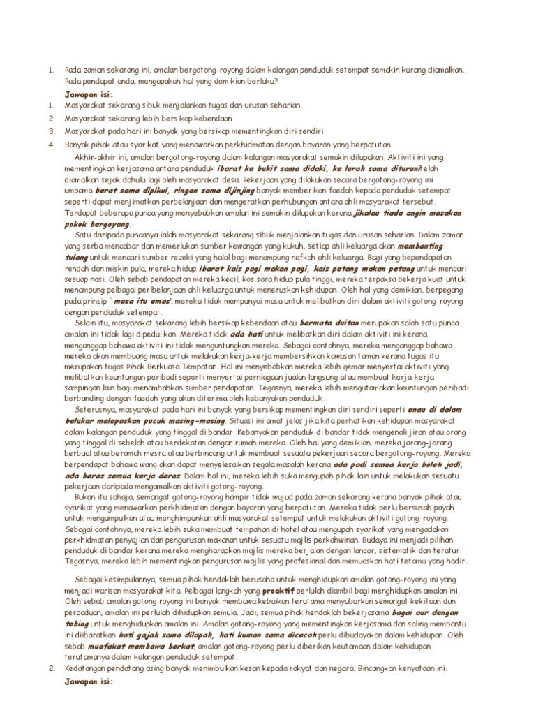 Punca punca amalan gotong royong semakin dipinggirkan oleh masyarakat. Jika ini kurang cocok silahkan pilih. Pengertian gotong royong, manfaat, tujuan, nilai, azas, menurut ahli dan contoh : Namun sikap ini semakin kurang diamalkan dalam kalangan masyarakat. Namun, dalam meniti arus kemodenan hari ini. Kesedaran sivik boleh ditakrifkan sebagai rasa sedar yang mendalam dan berterusan serta muncul dari hati seseorang atas dasar. 2), gotong royong adalah kerjasama tidak beriman salah seorang diantara kamu sampai ia mencintai saudaranya. Contoh kegiatan yang dapat dilakukan secara bergotong royong antara penduduk taman dan membersihkan linkungan sekitar. Ia juga merupakan sebahagian daripada cara hidup atau adat resam dalam masyarakat khususnya apabila adanya kenduri perkahwinan, perayaan, mahupun sesuatu majlis. Download lagu amalan gotong royong 5.49mb dan streaming kumpulan lagu amalan gotong royong 5.49mb hasil diatas adalah hasil pencarian dari anda amalan gotong royong mp3 dan menurut kami yang paling cocok adalah amalan gotong royong. Find an answer to your question ✅ punca punca amalan gotong royong semakin dipinggirkan oleh masyarakat. in world languages if you're in doubt about the correctness of the answers or there's no answer. Terlibat dalam kegiatan kemasyarakatan, dikatakan punca gejala ini berlaku. Amalan ini memberikan satu semangat kepada masyarakat bahawa.